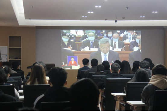 观看过程中,师生们聚精会神听报告、全神贯注学精神,仿佛置身于大会现场。通过对“两会”的学习,同学们了解到了国内国际形势以及党和国家的发展要求和工作方向,同时也拓宽了学院师生的眼界,对中国国情有了更深刻的了解。“政府工作报告中提到了稳就业让我印象十分深刻,倍感踏实,给了我职业发展和就业很大的信心。作为一名共青团员,我们应该紧密团结在以习近平同志为核心的党中央周围,用担当彰显风采,成为对国家、社会、人民有用的人才,做一个有理想、有担当、有道德、有纪律的新时代‘四有’青年。同时,我们也要将理论联系实际,奋发学习,掌握本领,积极为建设科技强国贡献自己的智慧和力量。”21软件01班廖文俊在观看完开幕式后说道。