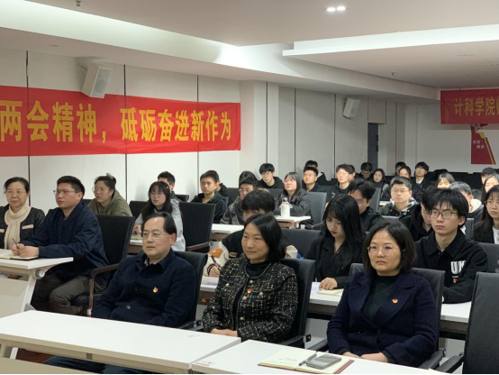 3月5日上午9时,第十四届全国人民代表大会第一次会议开幕式在北京人民大会堂隆重召开。为深入学习贯彻“两会”精神,提升学生的思想觉悟和政治素养,计算机科学与工程学院组织师生在致远楼1610会议室集中收看会议直播,聆听会议报告,第一时间了解“两会”内容。计算机科学与工程学院党总支书记肖燕芳、党总支副书记廖良梅、副院长何文德、学工办主任余潇、团总支书记胡立以及学生党员代表、学生干部代表参与了此次活动。