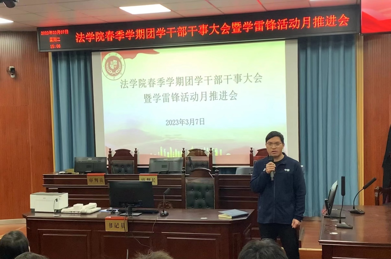 3月7日下午,法学院春季学期团总支学生会干部干事大会暨学雷锋活动月推进会在涵虚楼A多1教室顺利开展。党总支书记胡卉明、专职组织员夏湘远、副书记廖生成,辅导员钱文良、张正东以及团总支学生会全体干部干事参加此次会议。此次会议由廖生成主持,主要围绕新学期学生工作部署及学雷锋活动月推进工作内容展开。