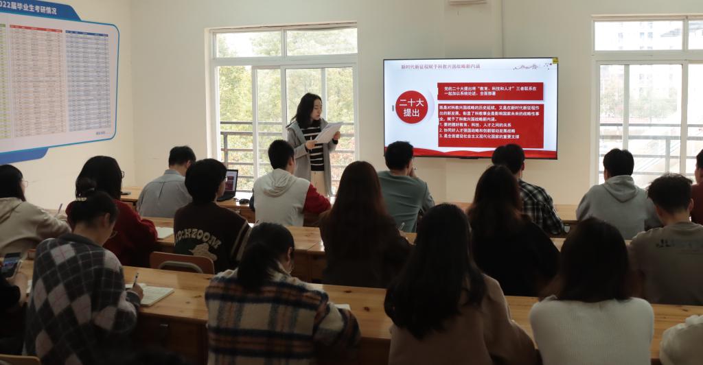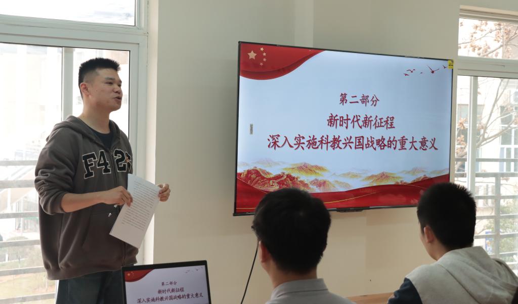 党的二十大报告指出:教育、科技、人才是全面建设社会主义现代化国家的基础性、战略性支撑。必须坚持科技是第一生产力、人才是第一资源、创新是第一动力,深入实施科教兴国战略、人才强国战略、创新驱动发展战略,开辟发展新领域新赛道,不断塑造发展新动能新优势。在活动的第一阶段,学生第一、第二、第三支部书记裴昊铭、龚越、林涵紧扣“科教兴国战略”这一主题,分别从新时代新征程赋予科教兴国战略新内涵、新时代新征程深入实施科教兴国战略的重大意义、新时代新征程深入实施科教兴国战略的推进路径等三个部分为同学们上了题为《新时代新征程实施科教兴国战略新内涵、重大意义与推进路径》的新学期第一堂党课。