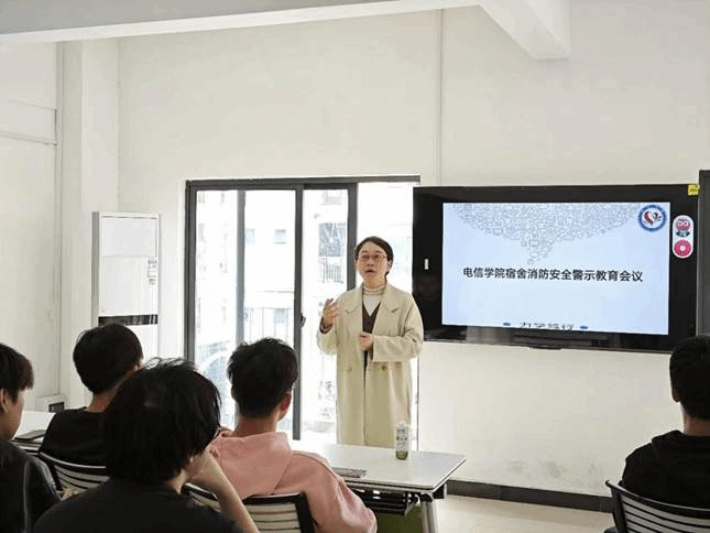 为切实加强我院学生宿舍安全管理工作,巩固“禁烟控酒”活动成果,充分发挥学生宿舍“一站式社区”育人阵地作用,3月9日中午12:30,我院在学生宿舍“一站式社区”敏学1栋B区开展宿舍消防安全警示教育会议,参加学生主要为重点“烟民”学生及宿舍包干学生党员。电信学院学工办主任周欣、20级辅导员谭宏政、21级辅导员蒋亮森参加会议。会议由22级辅导员、宿舍专干谢力主持。
