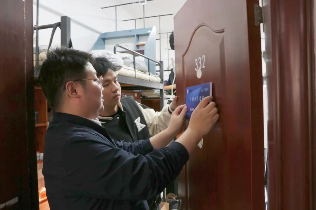 授牌仪式结束后,老师们和学生党员、干部走进宿舍,为宿舍挂上了象征责任和使命的“特殊门牌”。“示范牌于我们而言,既是肯定,也是一种责任,未来我们定会努力学习,发挥党员的带头作用,以身作则。”接过示范牌后,预备党员蒋四海激动的说道。