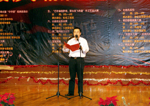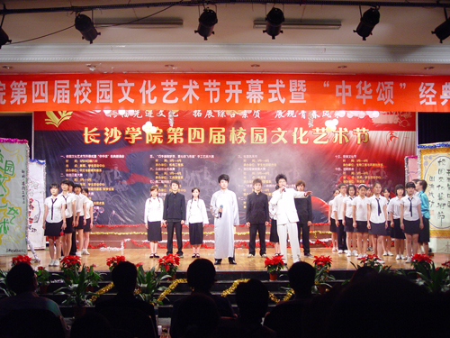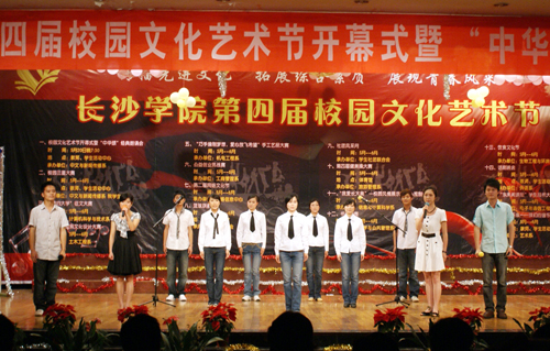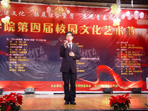 青春五月踏歌而来,我校第四届校园文化艺术节如期而至。5月20日晚,多功能厅内灯火辉煌,花团锦簇,洋溢着热烈的节日气氛。由我校团委和学生工作处主办,中文与新闻传播系协办的第四届校园文化艺术节开幕式在此隆重举行。参加开幕式的校领导和嘉宾有党委书记李咏芳,党委副书记、副院长李云龙,副院长郭清泉,中文与新闻传播系播音与主持专业特聘教授、湖南卫视主持人李兵,以及部分处室、系部负责人。李云龙致开幕词,他强调,青年兴则国家兴,青年强则国家强,并号召广大学生积极参与,在活动中提升自己的人文素质和艺术修养。