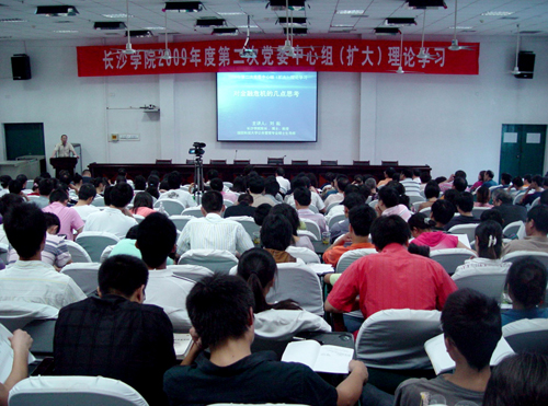 5月12日下午,在纪念汶川大地震一周年这个特别的日子里,我校在科技楼学术报告厅举办2009年度第二次党委中心组(扩大)理论学习,院长刘耘与党委中心组全体成员、全体中层干部、总支书记和部分团学干部谈了他对当前国际金融危机背景下中国经济现状及对策的几点思考,校领导李咏芳、李云龙、屈林岩、郭清泉、雍正海听取了讲座,报告会由党委书记李咏芳主持。