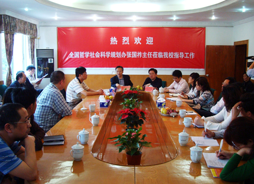 4月26日下午,全国哲学社会科学规划办张国祚主任、湖南省社科规划办邓清柯主任莅临我校指导工作,郭清泉副院长在二会议室热情接待了张主任一行。我校各社科系部部分的教授、副教授、博士参加了会议。