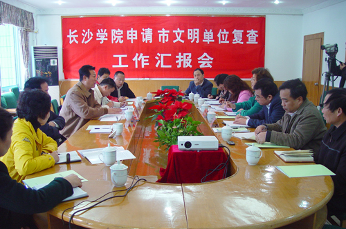 在全体与会人员观看了介绍我校发展历史的专题片《发展中的长沙学院》后,党委副书记、副院长李云龙汇报了我校文明单位创建工作的具体做法和主要成效。邢志忠一行对我校文明单位创建工作给予了充分的肯定,他们认为我校领导高度重视,组织到位,注重领导班子和干部队伍建设;管理规范,制度健全,创建工作落到实处;创建活动目标明确,特色鲜明,为长沙市经济社会发展作出了贡献;注重学校环境及周边环境的维护,构建了和谐、文明校园。同时,复查组还就我校争创市级文明标兵单位,进一步巩固文明单位创建工作所取得的成果,更好地发挥文明单位的示范和辐射作用等提出了指导性的意见。