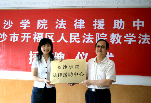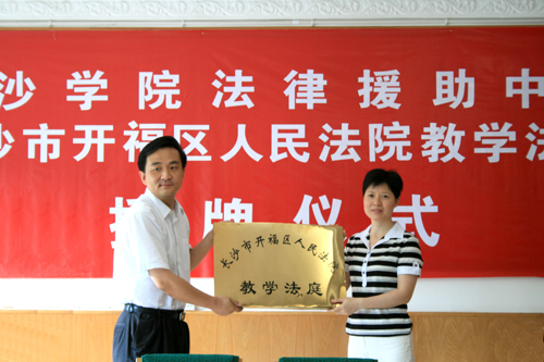 最后,长沙市法律援助中心主任郭灿霞、长沙市开福区人民法院院长袁征分别为长沙学院法律援助中心、长沙市开福区人民法院教学法庭授牌。