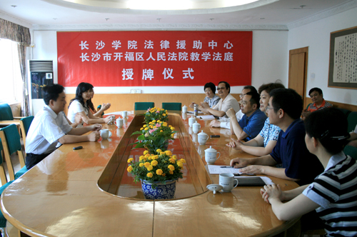 长沙市开福区人民法院院长袁征、长沙市法律援助中心主任郭灿霞分别发表了热情洋溢的讲话。他们一致认为,高校与地方法院、法律援助中心的合作能够使从事理论教研工作的教师与从事司法实务的法官相互学习、取长补短,是实现双方共同发展的重要举措,并对教学基地今后的发展寄予了殷切期望。