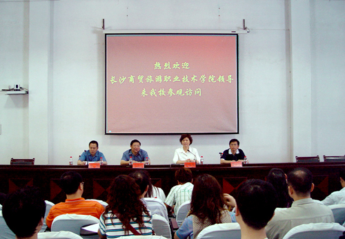 5月14日上午,长沙商贸旅游职业技术学院党委书记吴念公一行34人就学校建设发展的问题来我校访问。我校党委书记李咏芳,院长刘耘,副书记、副院长李云龙陪同参观团一行参观了我校校园和办学成果展,并在科技楼学术报告厅举行了学校建设发展经验交流会。副院长宋达、郭清泉,纪委书记雍正海及学校相关处室负责人出席了经验交流会。