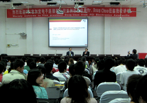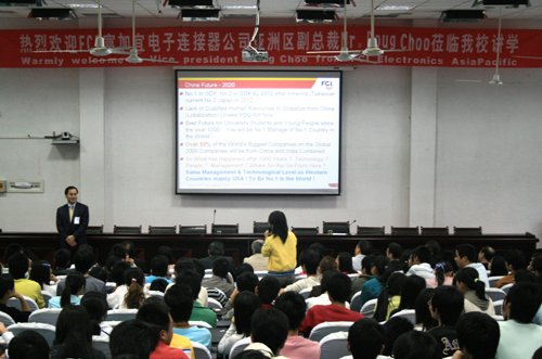 4月24日下午,FCI 富加宜电子连接器公司亚洲区副总裁Mr.Doug Choo在我校科技楼学术报告厅作了一场别开生面的学术讲座。
