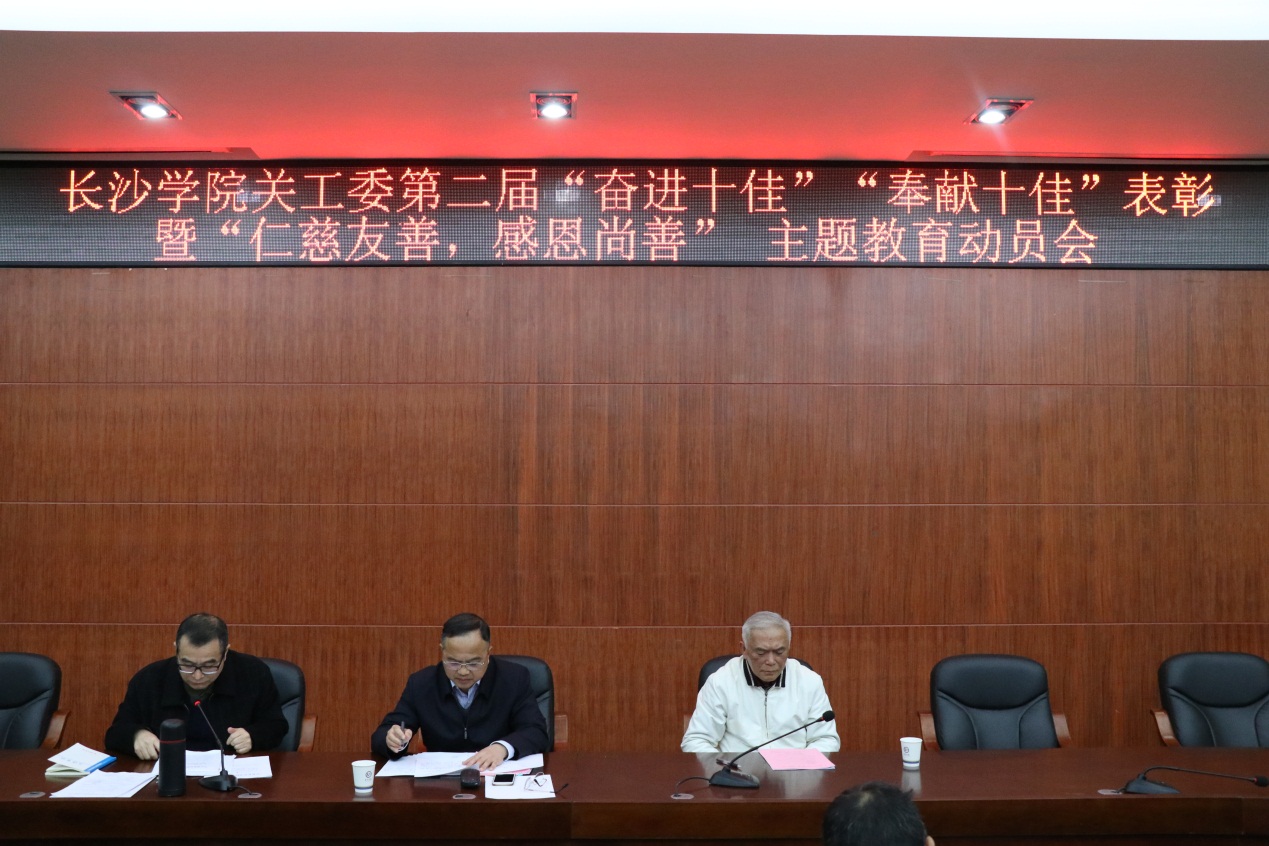 11月8日上午十点,我校关工委第二届“奋进十佳”“奉献十佳”表彰暨“仁慈友善 感恩尚善”主题教育动员会在图书馆一楼会议室召开。党委副书记、校关工委主任屈林岩,原长沙大学校长、关工委常务副主任李峻,长沙学院原党委副书记、现关工委副主任李云龙,关工委全体委员,各二级学院关工委主任、委员及授表彰奖励的学生出席了本次会议。会议由李云龙主持。