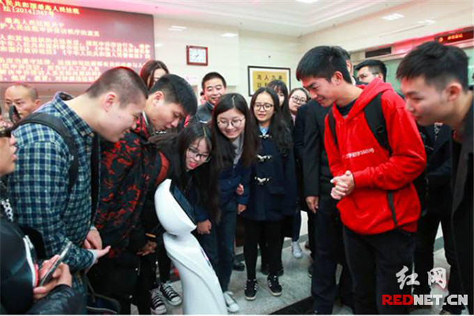 12月4日,湖南省高院公众开放日,“萌萌哒”机器人“小法”的亮相让长沙学院的学生们