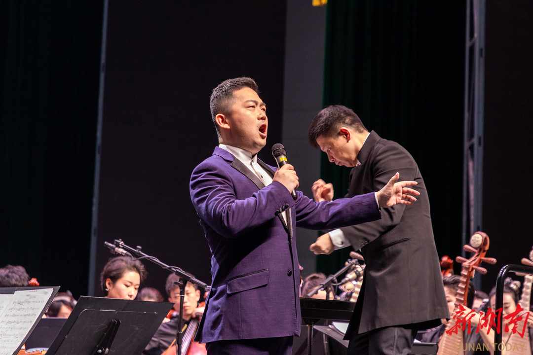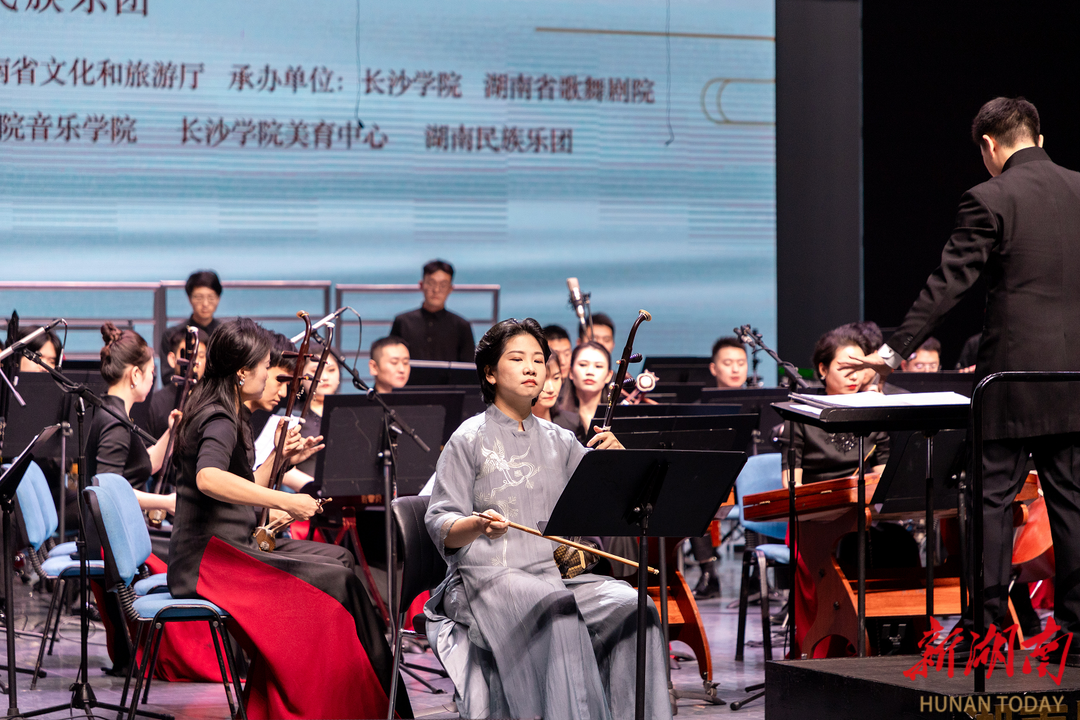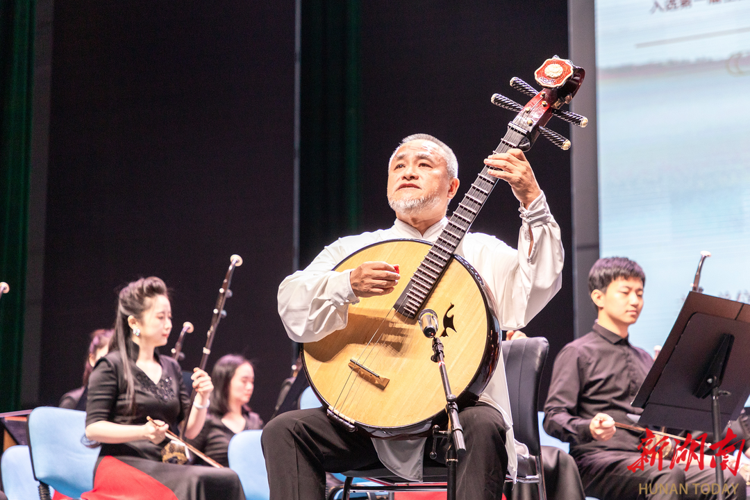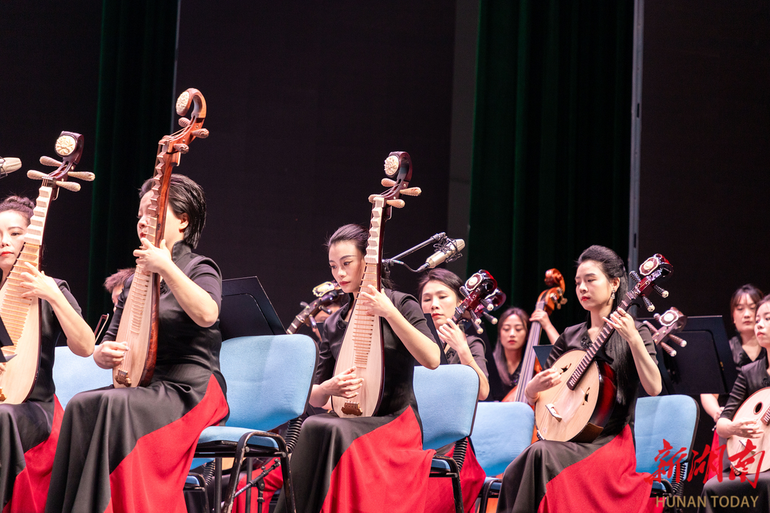 音乐会以《湘江北去》拉开序幕,表现出奔腾磅礴的气势和独具湖湘特色的音乐风格。《千古沉吟》将大阮与笙竽进行了反差式融合,充分演绎了诗人屈原的浪漫主义情怀。《芙蓉花韵》以二胡讲述了湖湘地域的人文风情,曲调起承转合,似故事在眼前缓缓铺展开。一曲《蝶恋花》用琵琶抒情,时而悠扬、时而恢宏,展现了一代伟人的情怀。