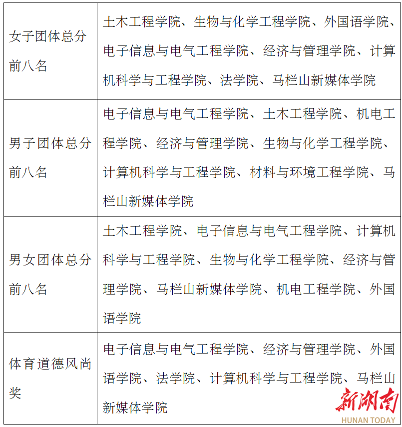 经过两天有序紧张的赛事比拼,土木工程学院获女子团体、男女团体总分第一名,电子信息与电气工程学院获男子团体总分第一名。电子信息与电气工程学院、经济与管理学院、外国语学院、法学院、计算机科学与工程学院、马栏山新媒体学院获体育道德风尚奖。(唐佳仪 李中泽 段舜予 牟胜硕 刘思涵 龚思云)