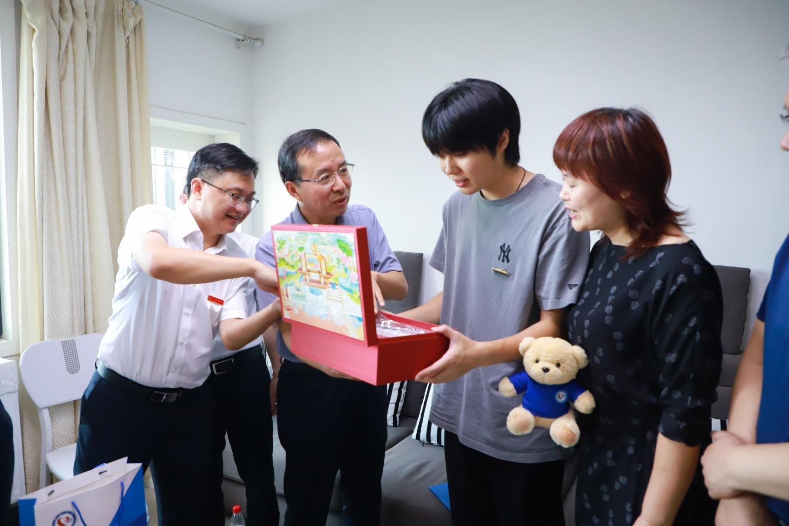 “恭喜你被长沙学院录取!”7月4日上午,长沙学院校长陈赤平携党政办、研究生学院、马栏山新媒体学院负责人来到长沙市雨花区湘水一城小区,将学校首封硕士研究生录取通知书送到新生李宁康手中。