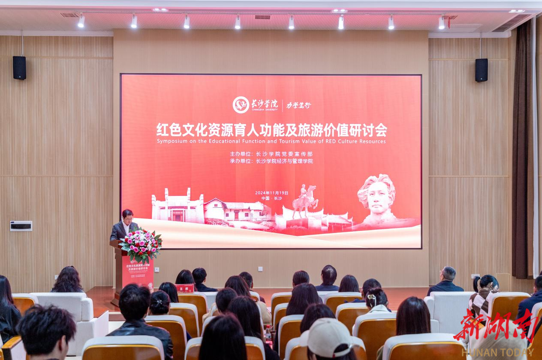 11月19日下午,由长沙学院党委宣传部主办、经济与管理学院承办的红色文化资源育人功能及旅游价值研讨会在经管类实训中心B307学术报告厅召开。长沙学院党委副书记刘寒波教授出席会议并致辞。来自湖南师范大学、湘潭大学、湖南省红色文化旅游促进会、马栏山视频文创园的各学界专家和企业嘉宾齐聚一堂,共同探讨红色文化在新时代背景下的育人功能与旅游价值。会议由长沙学院党委宣传部常务副部长徐远超主持。