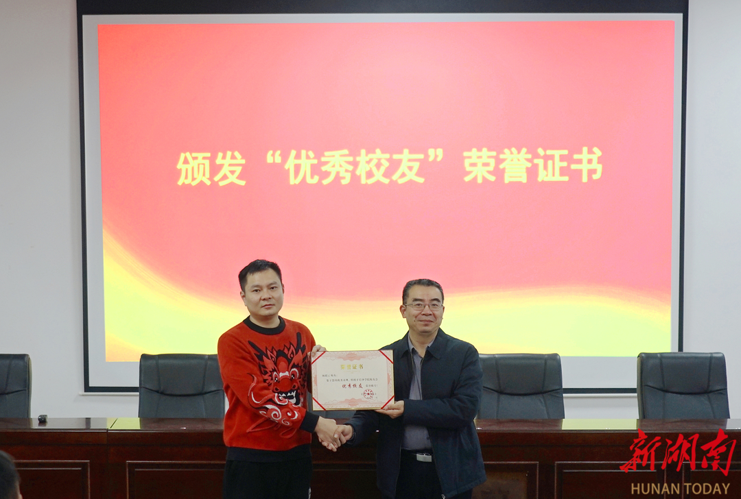 (△长沙学院党委委员、副校长何利华为杨超云颁发“优秀校友”荣誉证书)