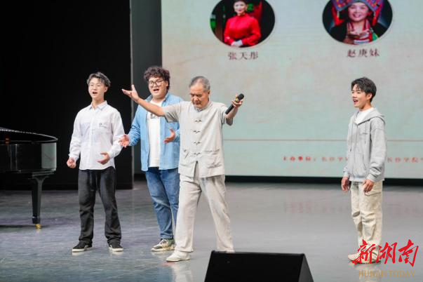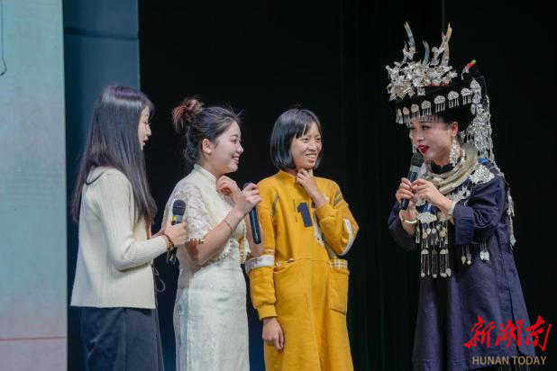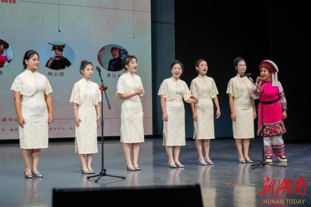 好山好水有好歌,湘西山青水柔的自然美景为民歌的创作提供了肥沃的土壤。桑植民歌传承人黄道英身着一袭精美的白族服饰,携手长沙学院音乐学院学生共同演绎了六首经典的桑植民歌,其中,《想坏姐来想坏郎》以细腻的歌词,婉转含蓄地描绘了青年男女间纯真的爱恋。湘西苗歌传承人秧云群展示了苗族长乐腔《恋山》《塘戏鱼儿鱼戏塘》等歌曲,并邀请了10名同学现场体验了苗歌真假声的不同之处。