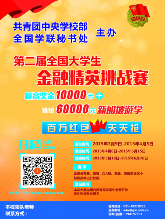 为推动青年学生“金融创业梦”计划,搭建金融界产学研交流合作平台,团中央学校部、全国学联秘书处拟于2015年举办第二届“大智慧杯”全国大学生金融精英挑战赛。现将大赛有关事项通知如下。