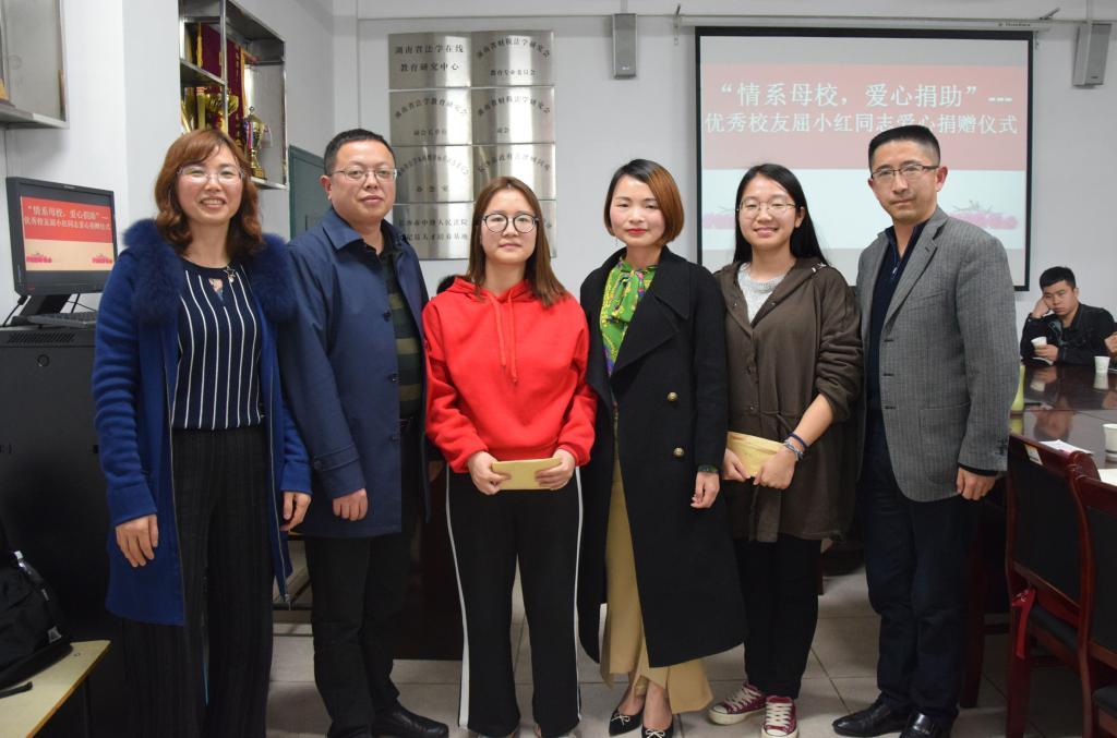 3月14日晚,法学院于涵虚楼A1404举办了优秀校友爱心捐助仪式。为回馈母校,传承助人精神,07级校友屈小红同志重回母校主动为两位贫困学生提供资助。
