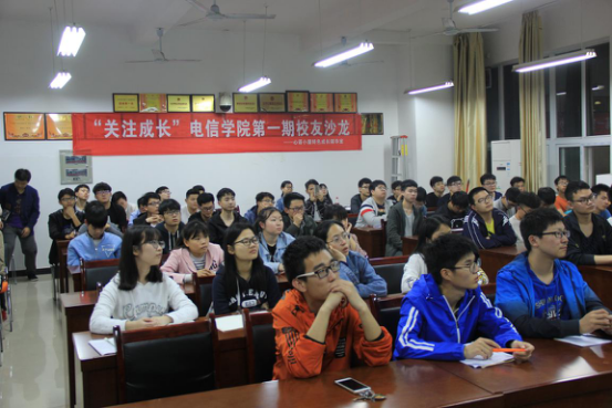 2018年3月30日晚,电信学院在理工楼B202举办“关注成长”第一期校友沙龙活动。2009届优秀校友肖学美受邀返校,从“工作与创业”角度向学弟学妹们分享自己从一名大学生到职场精英的成长经历。电信学院党总支副书记胡小毅、学工办主任江艳参加沙龙活动。