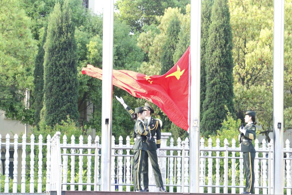 各行政班级在6:40到达天健体育场内,在划定的区域内集合完毕,仪式由院学生会副主席余畅泳同学主持,校国旗班组成的国旗护卫队精神抖擞、庄重威严,迈着整齐的步伐从体育场北端走向南端的国旗台,到场师生庄严注视,伴随着雄壮的国歌声,鲜艳的五星红旗冉冉升起。