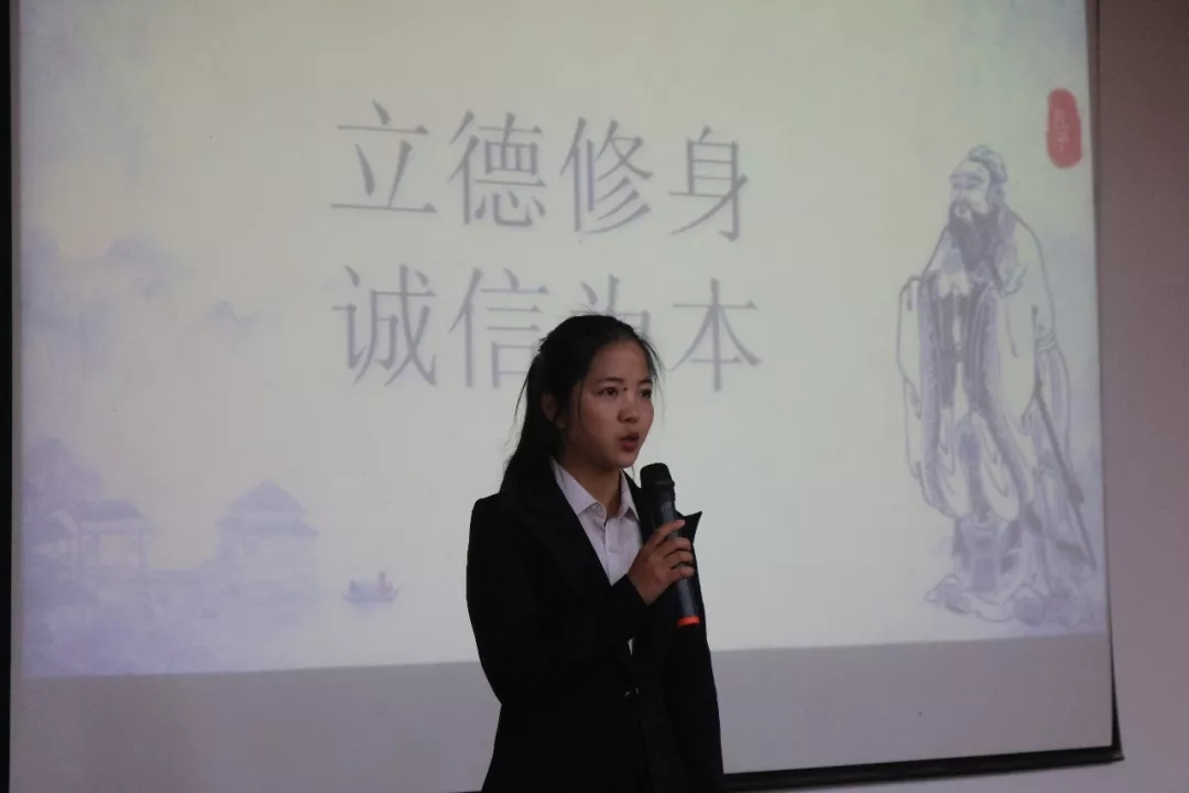 此次分“立德修身,诚信为本”主题个人演讲及“立德修身,诚信为本”东来阁讲坛团队演讲两个部分举行,在讲坛比赛环节,其中鹿鸣队以傅雷家书为切入口,在舒缓的背景音乐中娓娓道来诚信对于社会的重要性,采用喜爱的电影《天才枪手》中的经典片段展示了考试中的作弊现象,给同学们带来了一场精彩的诚信教育。在个人主题演讲部分,来自17翻译1班的彭影从“世间予我千万种芬芳,沿途逐枝怒放,而我,只要你一枝佩我胸襟、伴我一生——诚信”开始,慷慨陈词,主题鲜明,旁征博引,呼吁大家从这一刻开始,从小事做起,从身边事做起,一起行动,让诚信之花永不凋零,赢得了现场观众的一致认同。