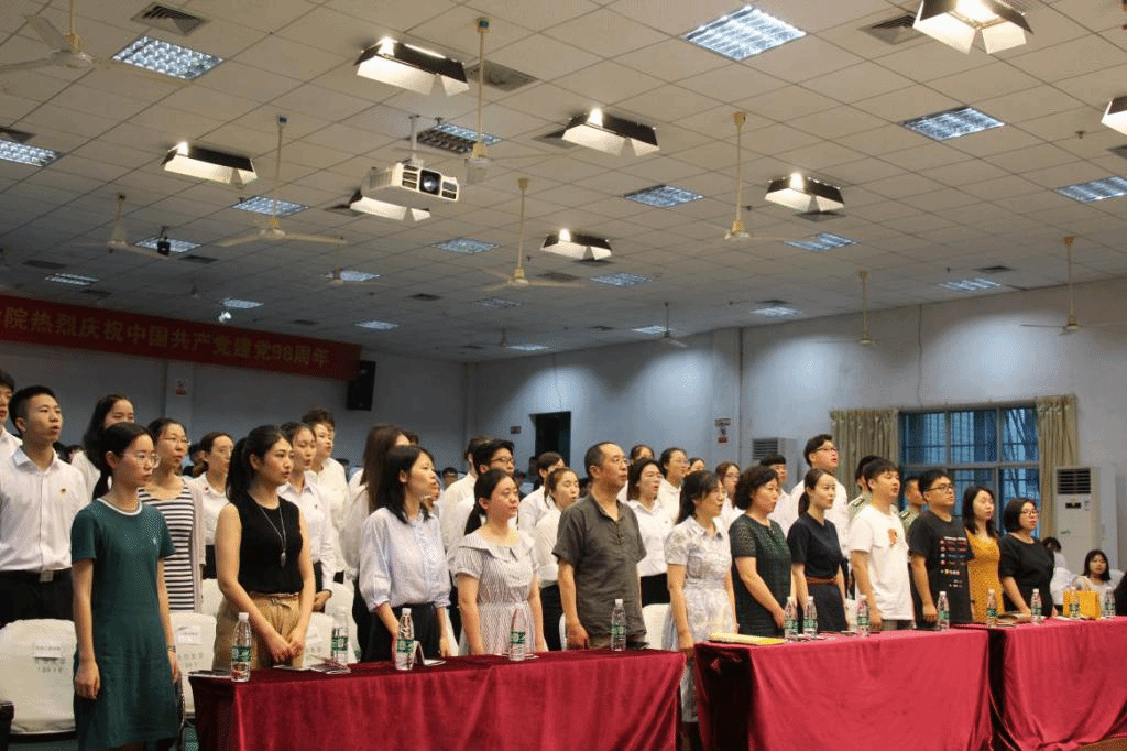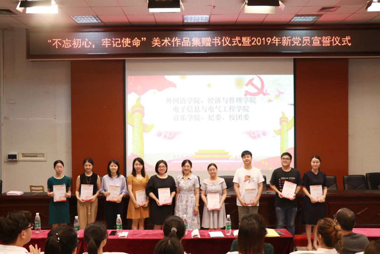 为庆祝中国共产党建党98周岁华诞。2019年6月27日下午,艺术设计学院在致远楼学术报告厅举办“不忘初心、牢记使命”廉洁美术作品集赠书仪式暨2019年新党员宣誓仪式。长沙学院党委委员甄洁洪、长沙学院校团委副书记尹方园、艺术设计学院党总支书记胡嫔、艺术设计学院副院长张建龙、其他各兄弟学院的老师及艺术设计学院全体师生党员、预备党员和积极分子出席活动。