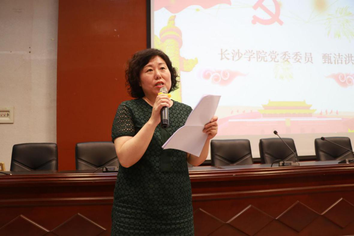 长沙学院党委委员甄洁洪为本次活动致辞,她特别提到了习近平总书记在中共中央政治局6月24日第十五次集体学习中的讲话给全体党员说初心使命,并对习近平总书记在纪念五四运动100周年大会上对新时代青年提出了“六要”的要求进行深刻解读。“广大青年要树立远大理想、热爱伟大祖国、担当时代责任、勇于砥砺奋斗、练就过硬本领、锤炼品德修为”,鼓励我们的同学胸怀共产主义远大理想,为党的事业奋斗终身。