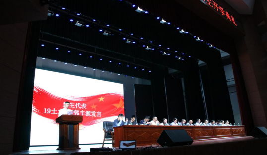 新生代表19级土木6班郭丰源同学通过自身感受讲出了对未来四年的希望,并号召在场的新生在大学四年里,不忘初心、牢记使命,修身立德,学好专业知识,努力服务国家和社会。