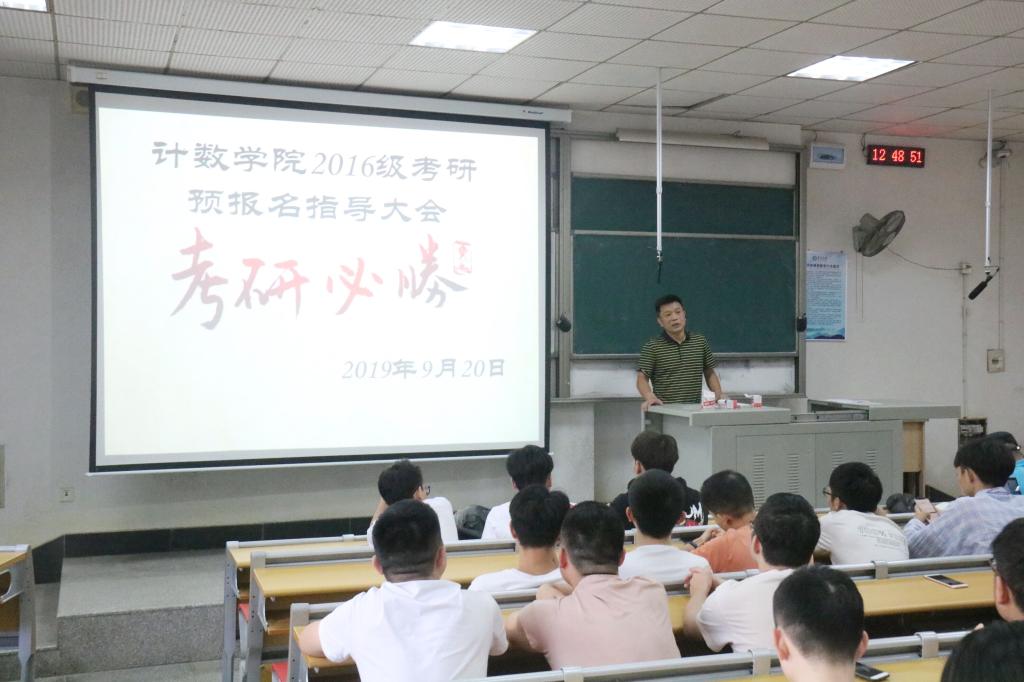 2019年9月20日中午12:40,长沙计算机工程与应用数学学院在涵虚楼B多1教室举行2016级考研预报名指导大会,计数学院院长李方敏,党总支书记曾一兵、副书记廖良梅出席,16级辅导员苏霖主持召开,16级200余名考研同学参加。