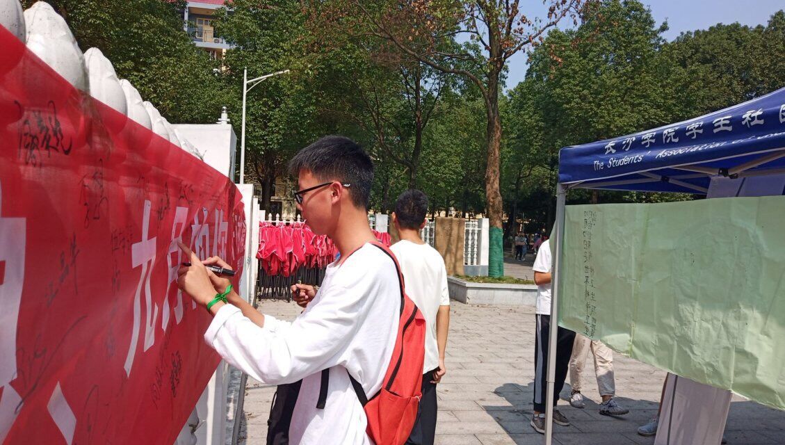 精卫日当天,二食堂外大道与维智摆点处都悬挂起了六米长的红色横幅。红白底色的横幅上,每个角落都被黑蓝墨迹晕染,留下了无数的签名。“纤笔一只谁与似?三千毛瑟精兵”。每一个签名都在向我们传递着阳光生活、积极向上的人生理念。