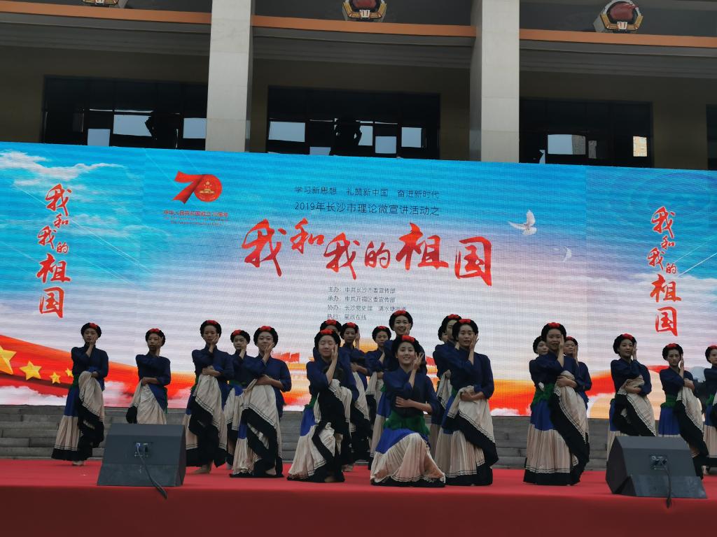为进一步激发广大群众的爱国情怀与自强不息、奋发向上的自豪感,长沙市委宣传部主办、开福区委宣传部承办的“学习新思想 礼赞新中国 奋进新时代”2019年长沙市理论微宣讲活动之“我和我的祖国”专题赛活动于9月29日上午在中共湘区委员会旧址(长沙党史馆前坪)进行,音乐学院2018级舞蹈学1班受邀表演彝族群舞《情深谊长》。