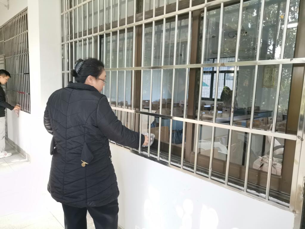 一名党员教师联系一个班级,负责一间教室,在全体教师党员的带领下,各班同学们展开了如火如荼的打扫活动。同学们明确分工,各司其职。同学们或是用扫帚清理地面垃圾,或是用手拾出抽屉垃圾。一位同学负责拿着扫帚,另一位就用工具承装,并能在互帮互助中感受到劳动的快乐。男同学大多负责用拖布拖洗地面,被拖过的地面洁净如新。女同学大多细心擦拭着窗户,用擦布擦拭后又用纸巾擦掉水渍,窗户显得十分干净。在温暖的阳光下,同学们细心认真的进行打扫,对自己的劳动成果感到自豪,同时为寒冷的冬天增添了暖意。