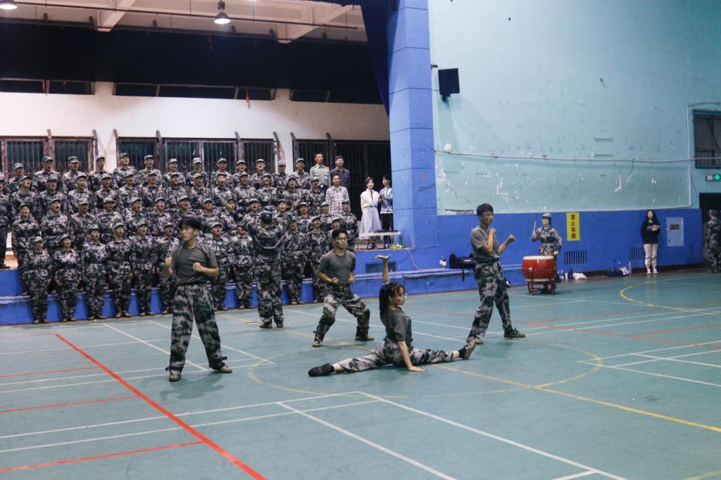 夜幕之中,永康体育馆外灯火阑珊,馆内礼乐交融。6个专业分为8支连队参与比赛,参赛队员着装整齐,精神饱满,朝气蓬勃。计数学子在这里用《精忠报国》《祖国不会忘记》《我的中国心》表达了对祖国炙热的情感和热爱。《最初的梦想》《少年中国说》这样的流行歌曲,也从全新的一面,诠释了当代新青年的使命和担当。最后令人瞩目的《渴望光荣》把比赛推向高潮,舞动的红旗将人引领进火热的绿色军营。旗阵队形变化多姿,时而整齐如一,时而错落有致,时而纵横交织,令人目不暇接。赛后曾一兵书记指出:“比赛不是目的,它只是让军训新生成长的过程,不论排名,每一个连队,都唱出了军人的士气和军队的凝聚力”。