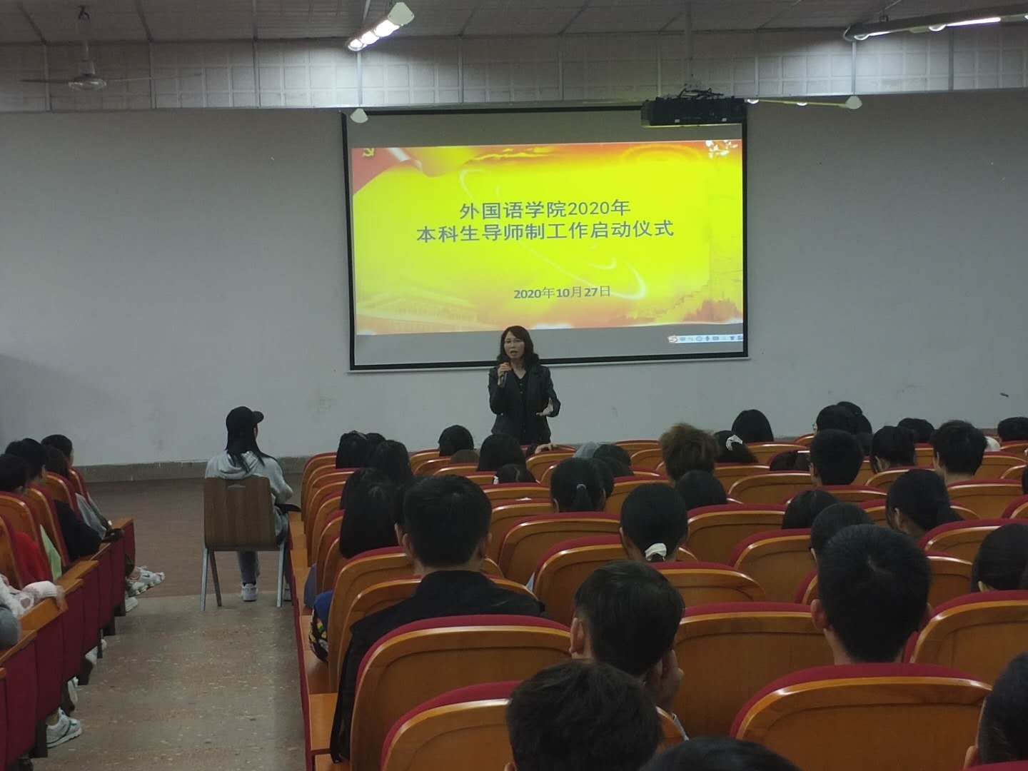 10月27日下午,学院本科生导致制工作启动仪式在宁静楼T2进行,导师代表、辅导员和2020级全体学生参加了本次启动仪式。会上,党总支书记刘秋菊,对导师作了既教书又育人的要求,向2020级学生介绍了外国语学院本科生导师制的相关内容,对新生们提出了殷切希望,希望每位学生在导师的指导下做好学习规划、人生规划,在美丽的长大成就最美的自己,成为有家国情怀、有国际视野、有责任担当、有扎实专业功底的长大外语人。