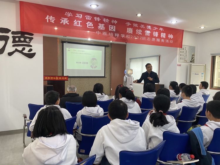 3月14日上午,由长沙学院计算机工程与应用数学学院NxetGen创新实验室所开发的教育智能机器人“小宝”化身党史“考官”,为中雅培粹学校举办的“传承红色经典,延续雷锋精神”志愿服务活动充当“主角”,为近百名同学及家长带来了智能科技的全新体验。