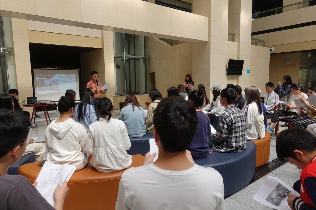 活动伊始,外国语学院2018级翻译2班刘文仪带领在场师生朗读了《七律•长征》《浪淘沙•北戴河》《浪淘沙•改革开放》和《美好新时代》等四首经典红色诗歌。