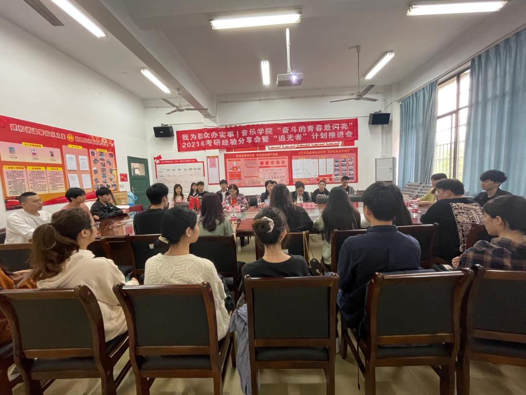 5月25日下午,音乐学院在音乐楼105会议室召开“奋斗的青春最闪亮”——2021年考研经验分享会暨“追光者”计划推进会。党总支书记陈滨滨、党总支副书记刘静、学院关工委副主任刘利元、教研室主任贺辉、2021届考研上岸学生代表、准备考研学生、“追光者”计划学困一对一帮扶代表等参加。本次会议根据深化党史学习教育,落实“我为群众办实事”要求,以“精抓两头带学风”为抓手,办实事,解难题,以学困生为重点,以考研就业出口为契机,用实际行动帮扶促学,切实促进优良学风建设。会议由辅导员张腾主持。