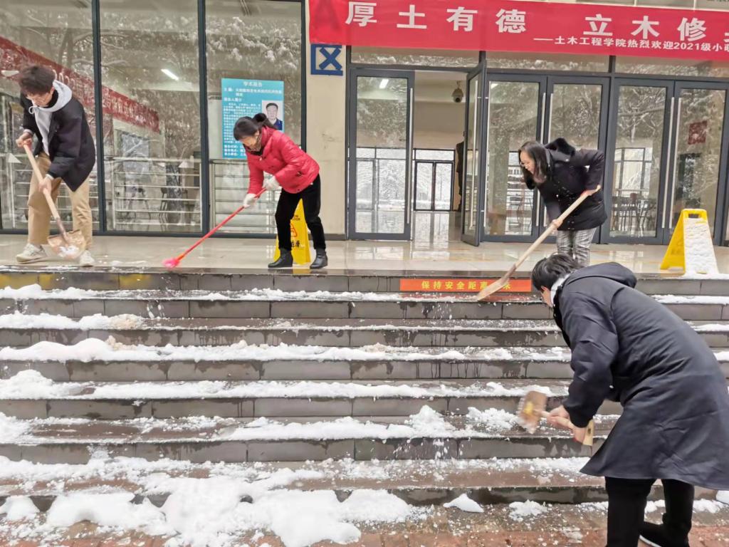 乍暖还寒,春寒料峭,校园被大雪覆盖,厚厚的雪堆积理工楼A区,地面湿滑给师生出行带来了很大不便。2月23日一大早,在学院党总支书记杨群英带领下,学院物业工作人员和师生党员借来铁锹和扫把,对理工楼A区周边进行义务除雪,为师生出行保驾护航。