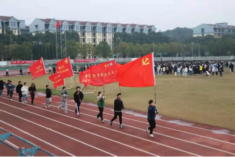 升旗仪式后,在场的学生进行了一圈红色接力跑,接力跑在党旗的引领下,按照“1920-1925-1949-1957”团的四个重要节点设置红色任务。象征着共青团经历了一次次革新,一次次升华,一心向党,永远跟党走的决心。