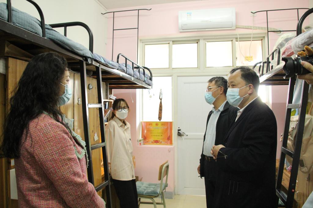 张世英副校长就平时生活饮食习惯、线上课程学习等情况与同学们进行亲切交谈,并叮嘱同学们要持续保持宿舍内务卫生整洁宜居,离开宿舍应当做好个人防护,在线学习也要保持认真态度,确保线上学习效果不打折扣,利用课余多运动加强体质锻炼,养成良好的生活习惯。