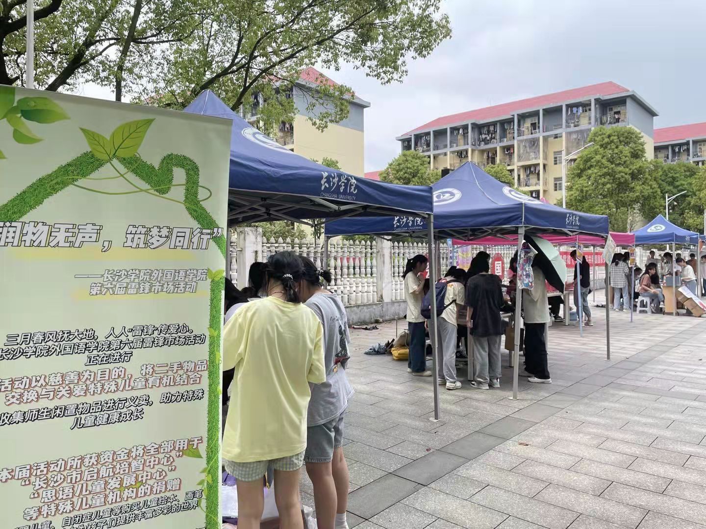 春风化雨润人心,雷锋精神代代传。为进一步在校园内弘扬勤俭节约、无私奉献的雷锋精神,提高校内二手闲置资源的利用率,外国语学院青年志愿者协会于2022年4月26日在维智广场面向全校师生开展以“润物无声,筑梦同行”为主题的雷锋市场义卖活动,本次义卖款项将全部用于对特殊儿童机构的公益捐赠。
