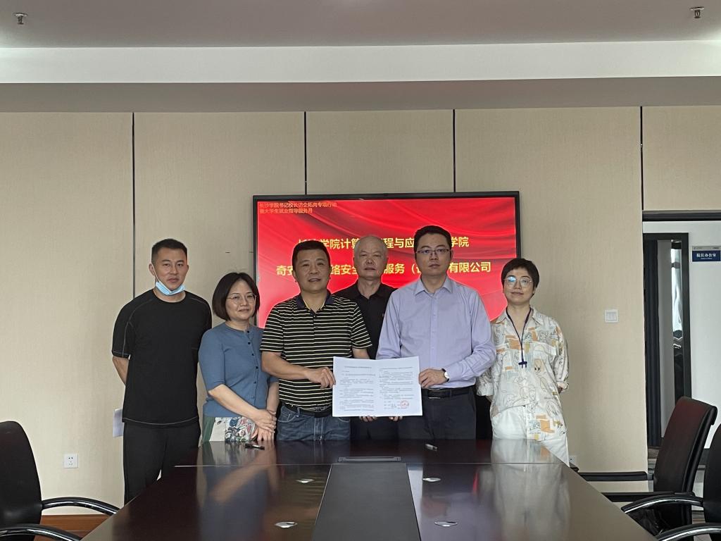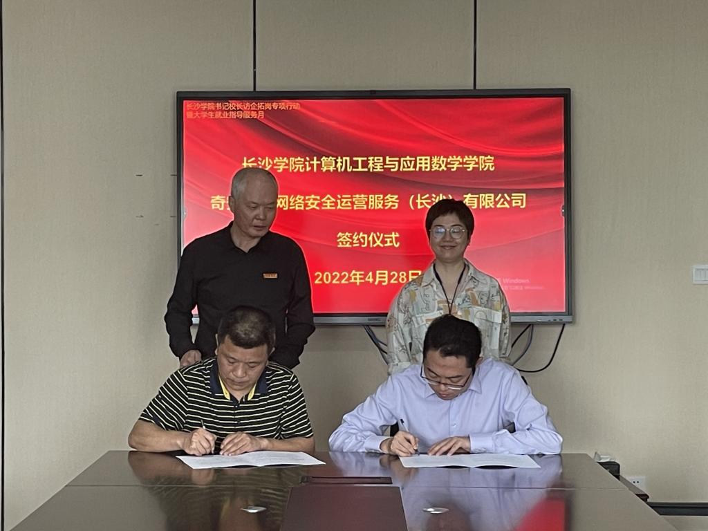 为深入推进就业“一把手工程”,在稳就业保就业促就业上出实招,长沙学院计算机工程与应用数学学院(以下简称计数学院)于4月28日上午9:30,在致远楼1612会议室与奇安星城网络安全运营服务(长沙)有限公司举行就业实习基地协议签约仪式,公司总经理王鑫、综合管理部总监范丽萍作为代表出席,计数学院院长李方敏、党总支书记曾一兵、副院长何文德、副院长赵碧海、党总支副书记廖良梅作为院方代表参加,校企双方代表举行会谈,双方就产学研合作交换意见,取得了丰硕的合作成果。