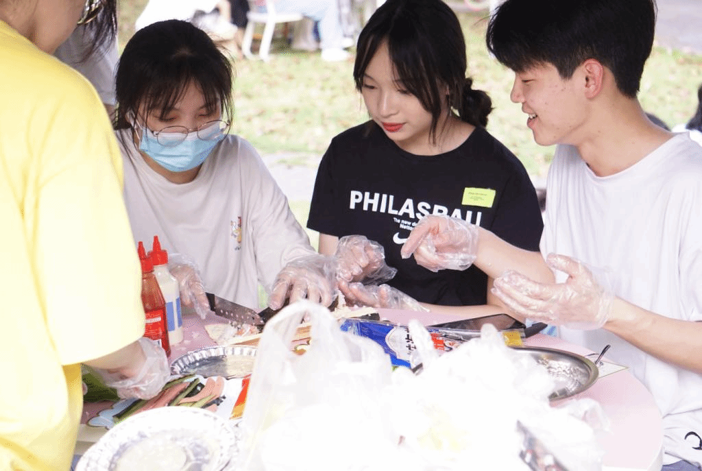 本次游园会主题为“外语说世界,文化游天下”,分语言体验区、游戏互动区、文化展示区、美食品尝区以及积分抽奖区六部分组成。春意盎然,微风不燥。穿过弧形的游园会拱门,手持精美的游园指南,精心设计的趣味互动、滋味可口的美食小吃、别出心裁的小礼品,慕名而来的“游客”流连于各个区域体验不同语言的乐趣和文化内涵。语言体验区,“请说出这个手势在哪个国家代表哪种含义!”“Bingo!”,美食摊前,老师展示寿司的制作步骤,“小徒弟们”学得有模有样......。说外语、学知识、玩游戏、品美食、赏海报、赢礼品,外语角广场到处洋溢着欢乐的气息,一系列精彩纷呈、别具一格的趣味活动吸引了一批又一批的外语爱好者。