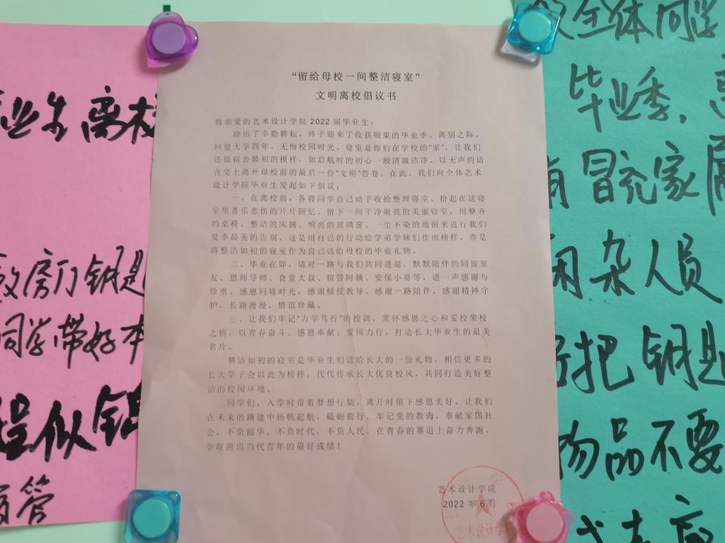 湘暑六月,凤凰花开的时节,又到了一年一度的毕业季。6月8日,艺术设计学院发布《“留给母校一间整洁寝室” 文明离校倡议书》,向全体毕业生倡议“把整洁如初的寝室作为送给母校的毕业礼物,用自己的行动给学弟学妹们做出榜样;对风雨兼程时默默陪伴守护、披荆斩棘时给予信任鼓励的同窗室友和宿管阿姨道一声珍重;以青春奋斗、感恩奉献、学史力行打造长大毕业生的最美名片……