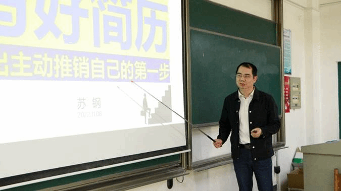 随后,苏钢副院长以幽默风趣的语言向同学们介绍了如何迈出主动推销自己的第一步,讲述简历应该如何撰写,并指出简历撰写的常见错误,要求同学们在撰写过程中要严谨与实事求是,强调潜力和差异性,将自己优秀的一面展示出来。