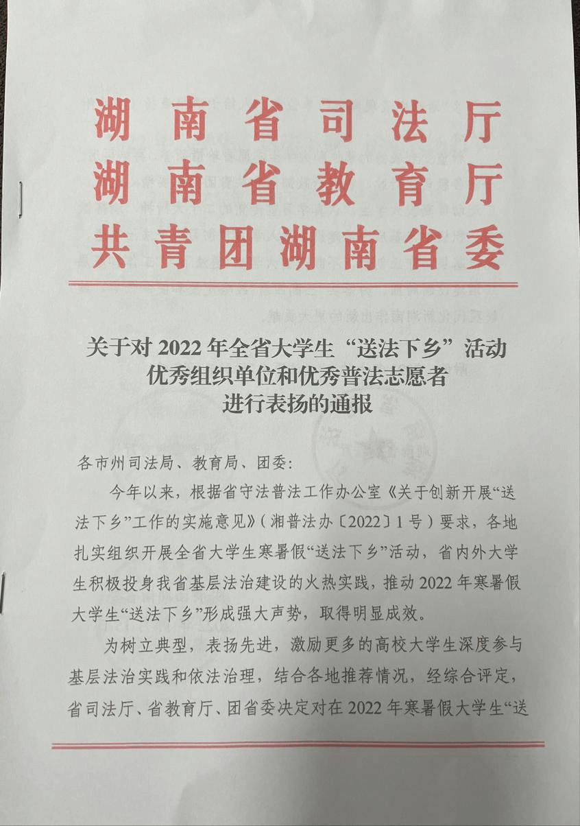 11月18日上午,湖南省司法厅在九所宾馆组织召开全省大学生“送法下乡”活动总结交流会。我校荣获2022年大学生“送法下乡”活动优秀组织单位,法学院20级法学专业赵文同学获得“送法下乡”活动“优秀普法志愿者”。