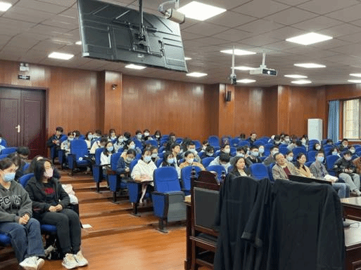 模拟法庭教室里,洋溢着浓郁的学习氛围和热烈的青春气息。丁文从党的二十大精神、对青年的殷切期望两个方面,与同学们进行了深入交流。
