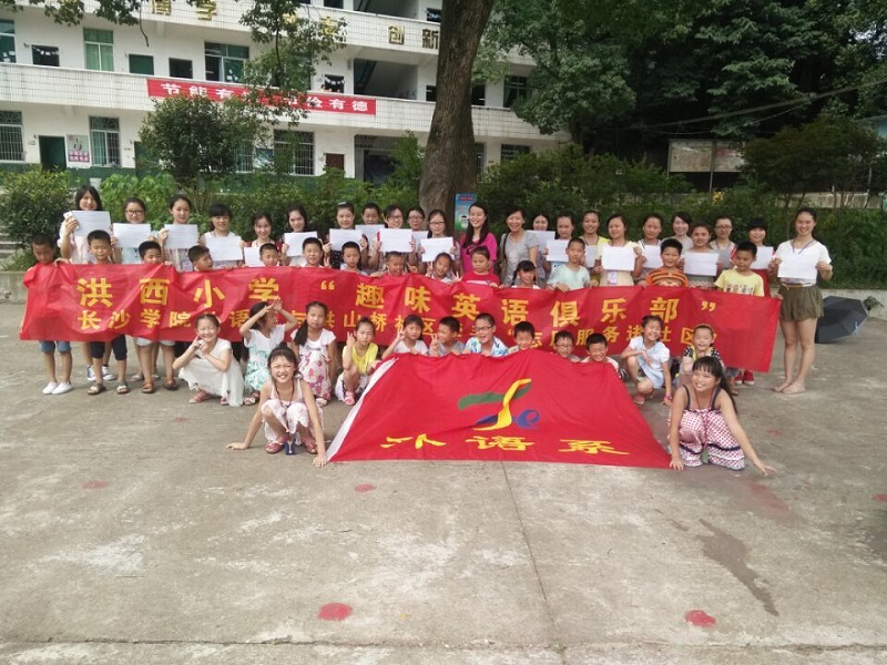 为践行雷锋精神,繁荣基层文化生活,全面推进校地合作建设,打造“校地共建”新平台,外语系在2015年5月初与洪山桥社区进行合作,创建洪西小学趣味英语俱乐部,为洪西小学提供志愿教学服务。在活动举办之初,外语系进行志愿者招募,共有51名志愿者踊跃参与报名与面试。最后,综合语音语调、教学经验以及讲台表现力等多重因素,25名志愿者在面试中脱颖而出,成为趣味英语俱乐部的志愿者老师。5月12日下午2点,经过重重选拔、脱颖而出的志愿者们伴着暖阳,迎着微风,满怀热情地来到了洪西小学,开展第一次趣味英语俱乐部活动。共青团长沙学院委员会尹方圆老师、长沙学院外语系党总支贺革书记、洪山桥社区党支部黄滔书记以及洪山桥社区工作人员同行。志愿者们一进入洪西小学的校园,便受到孩子们的热烈欢迎。在简短的相互认识了解后,志愿者们开展了英语单词接龙、“我说你猜”、英语歌曲学唱、英语话剧等多种形式的教学。孩子们在此过程中热情高涨,积极配合,现场气氛十分活跃。
